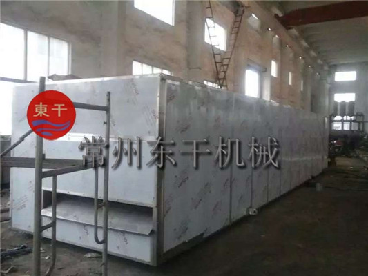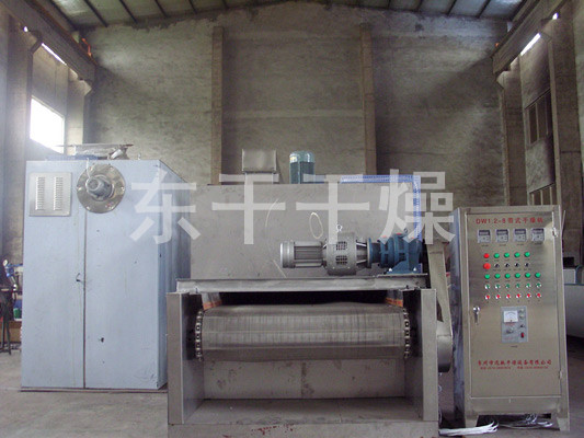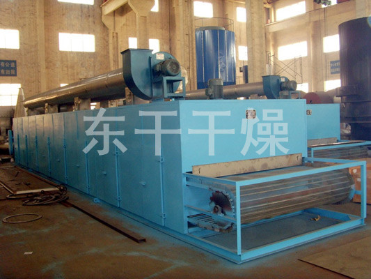 物料由加料器均勻地鋪在網(wǎng)帶上,網(wǎng)帶一般采用12-60目不銹鋼絲網(wǎng),由傳動裝置拖動在干燥機(jī)內(nèi)移動。干燥機(jī)由若干單元組成,每一單元熱風(fēng)獨(dú)立循環(huán),部分尾氣由專門排濕風(fēng)機(jī)排出,廢氣由調(diào)節(jié)閥控制,熱氣由下往上或由上往下穿過鋪滿物料的網(wǎng)帶完成熱量與質(zhì)量傳遞的進(jìn)程,帶走物料水份。網(wǎng)帶緩慢移動,運(yùn)行速度可根據(jù)物料溫度自由調(diào)節(jié),干燥后的成品連續(xù)落入收料器中。上下循環(huán)單元根據(jù)用戶需要可靈活配備,單元數(shù)量亦可根據(jù)需要選取。