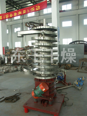 濕物料自頂部加料口進(jìn)入螺旋床內(nèi),在周向激振力及重力的作用下,物料沿螺旋床自上而下作跳躍運(yùn)動(dòng)直至最底層;同時(shí),潔凈的熱風(fēng)由螺旋床底部進(jìn)入,與分布在床上的物料進(jìn)行充分的傳熱和傳質(zhì)后,由頂部排濕口排出。從而使物料達(dá)到了干燥的目的。
